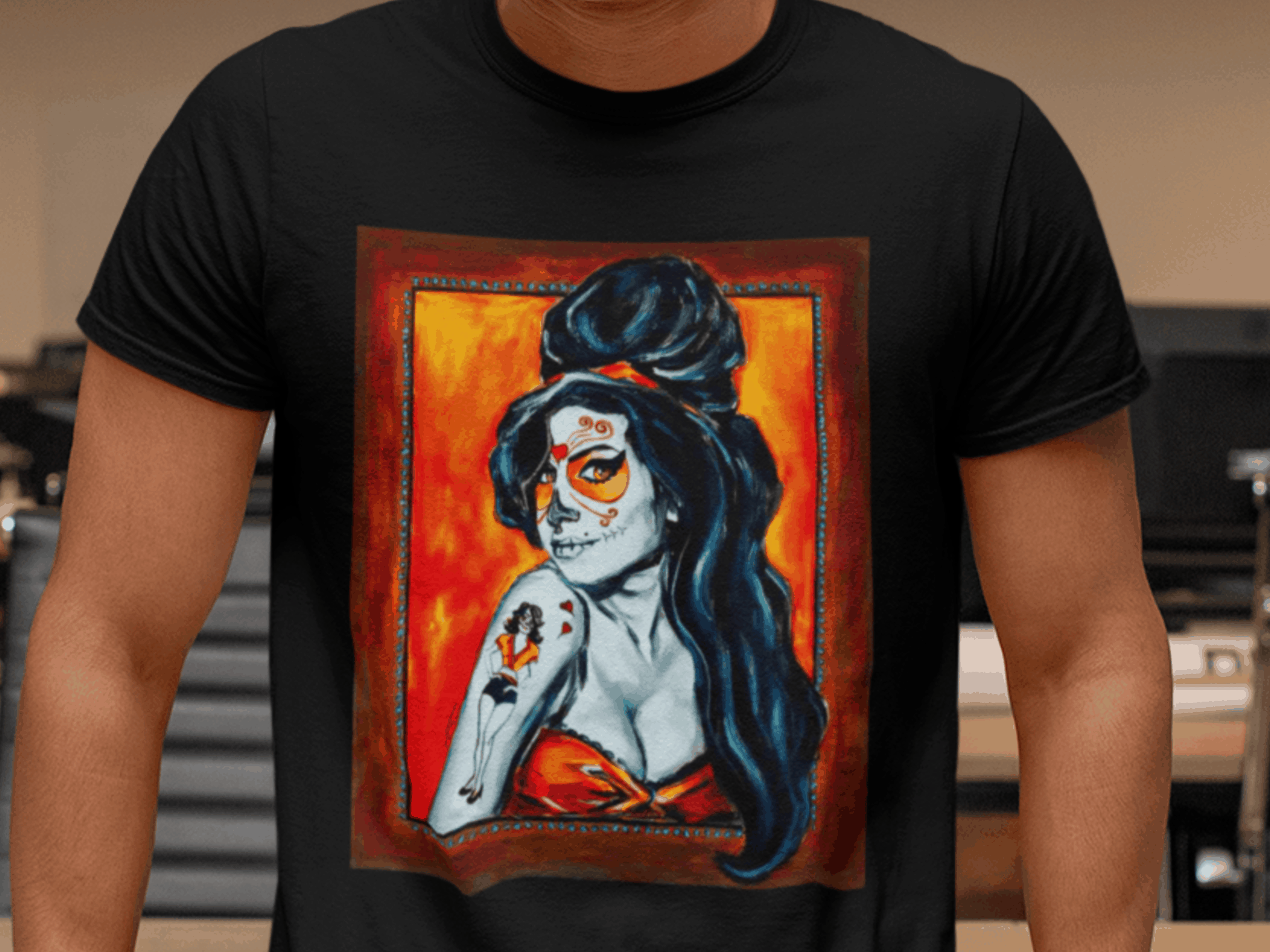 Vista-se com estilo e reverencie a lendária Amy Winehouse com esta camiseta estampada. A arte detalhada captura a alma única da diva do soul. Uma homenagem fashion à inesquecível voz que deixou sua marca na música.