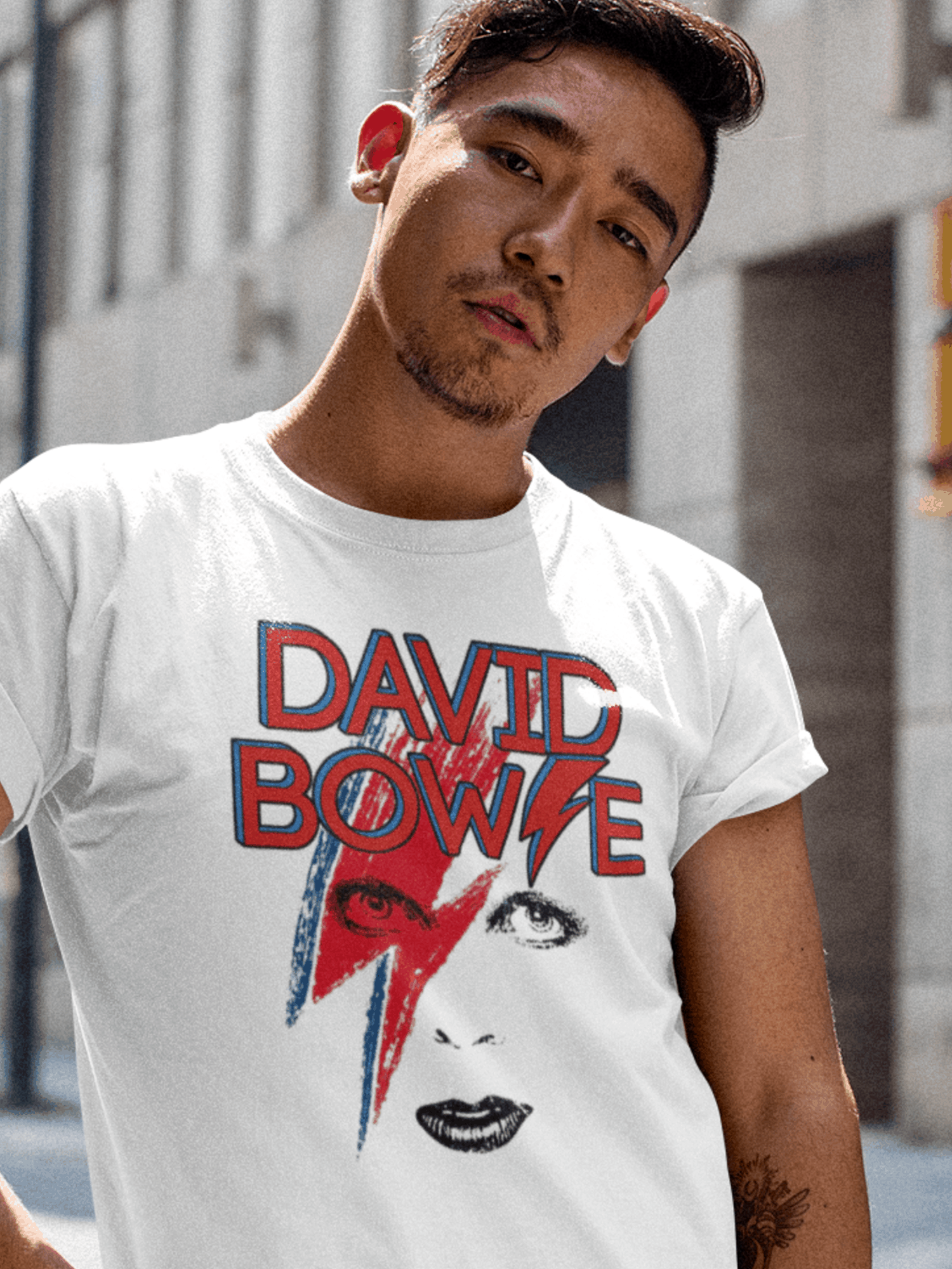 Camiseta estampada com o camaleão do rock, David Bowie. Vista-se com a essência inovadora e ousada desse ícone musical.