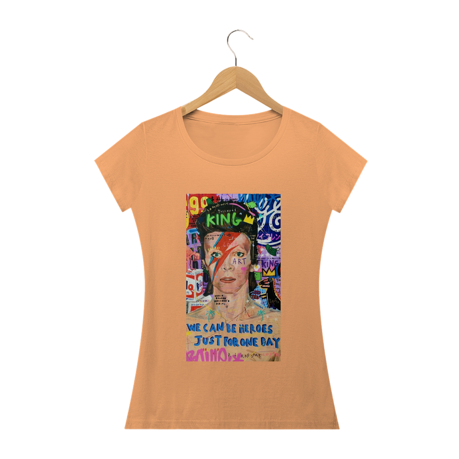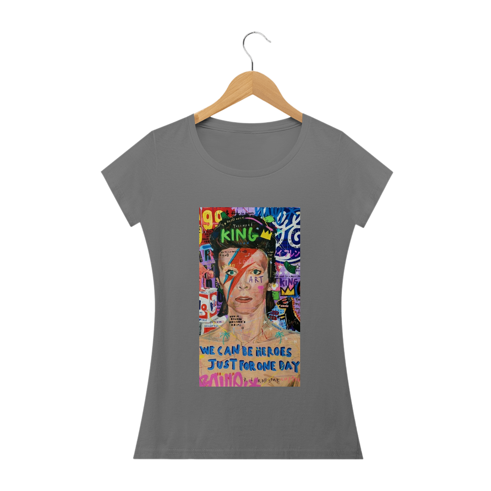 Celebre a genialidade e o estilo icônico de David Bowie com esta camiseta estampada em estilo arte pop. A estampa traz uma interpretação colorida e vibrante do lendário músico, capturando sua personalidade audaciosa e sua inovação artística.