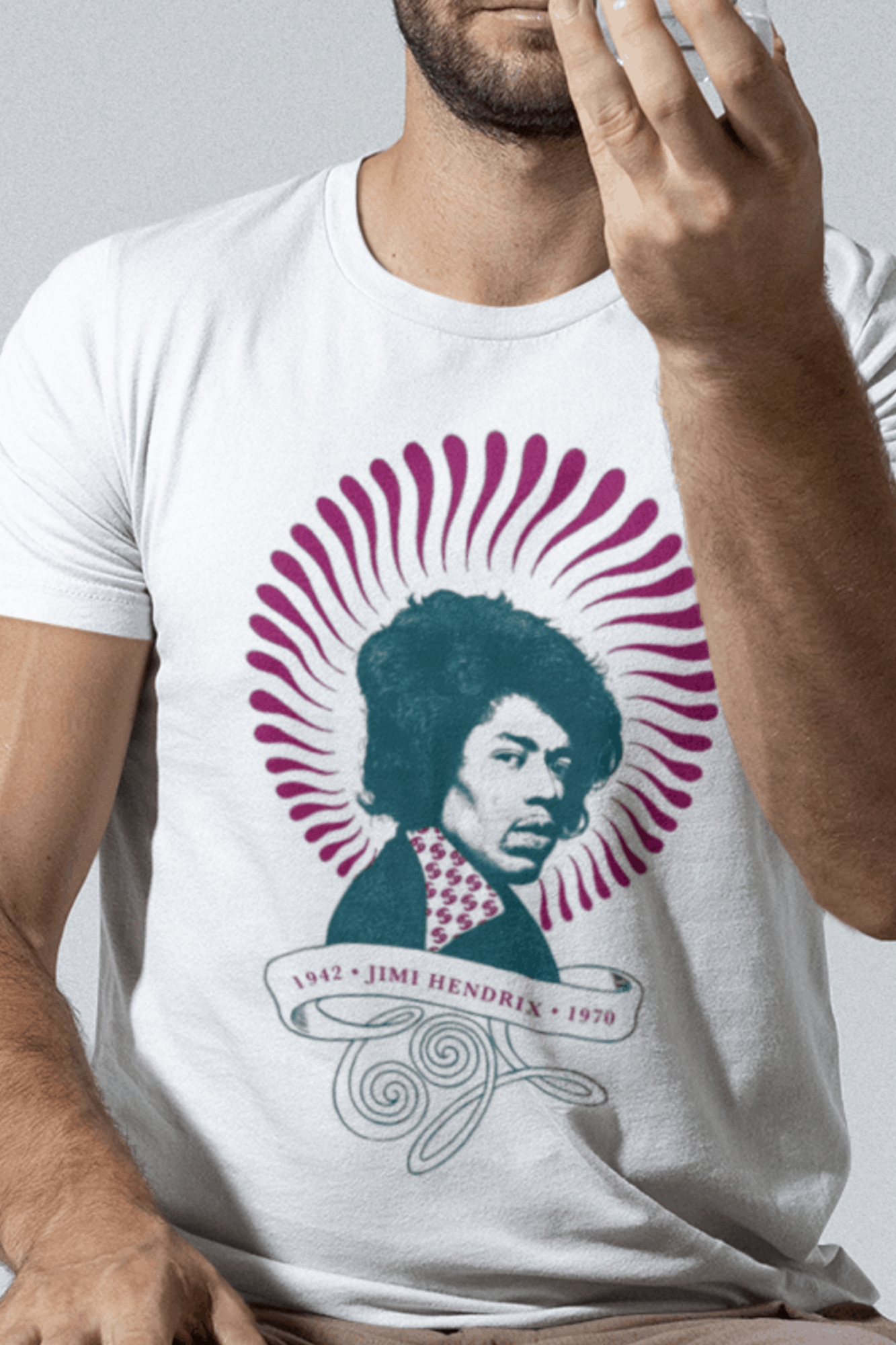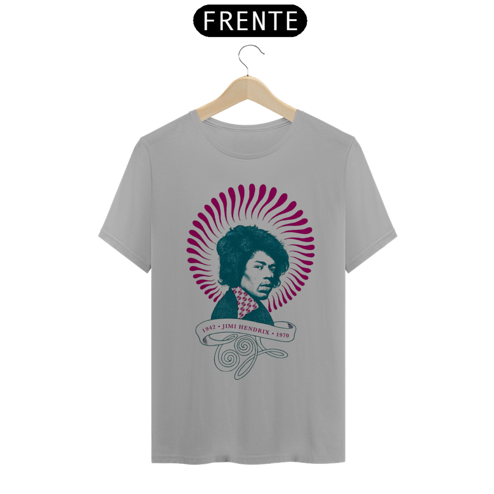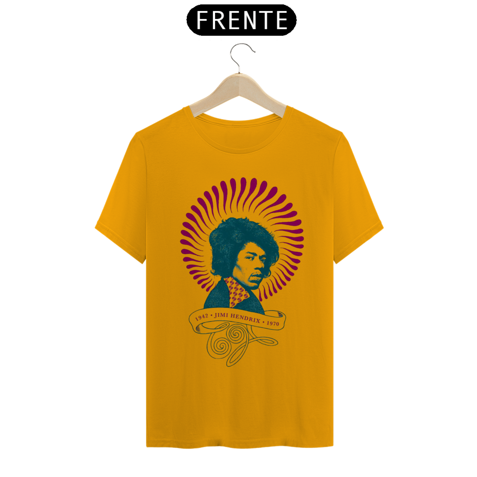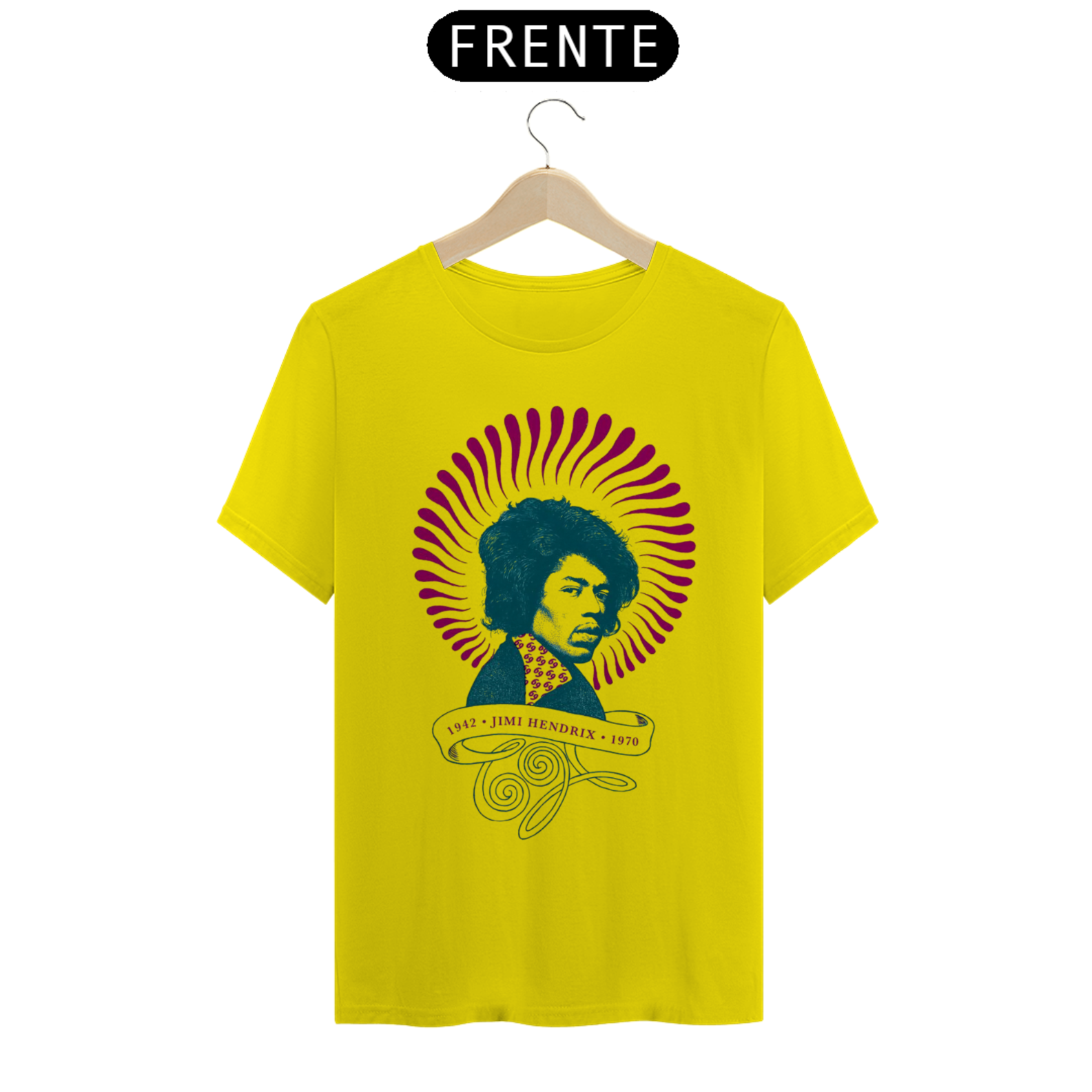 Camiseta eletricamente estampada com o lendário Jimi Hendrix. Vista a energia do maior guitarrista de todos os tempos.