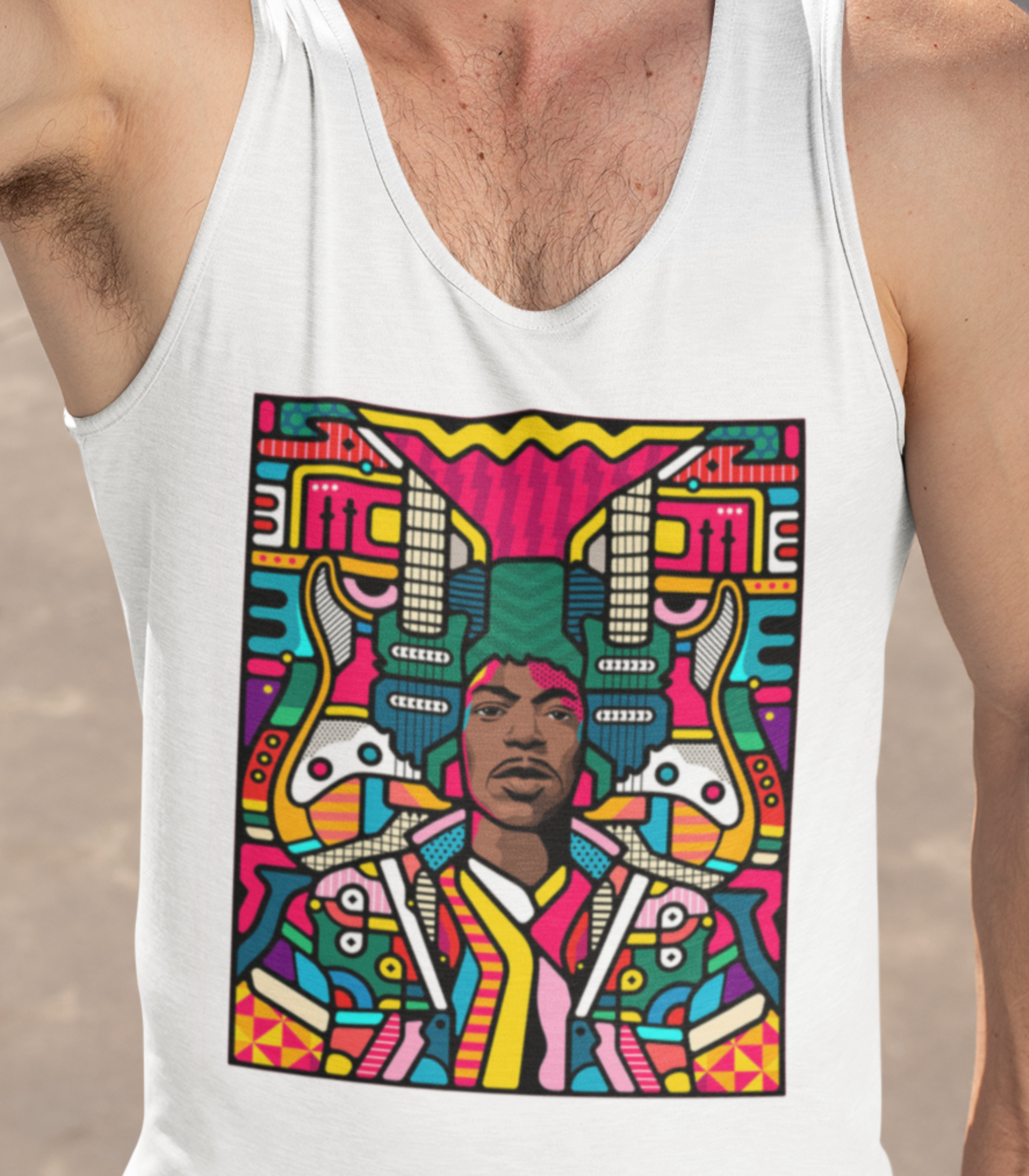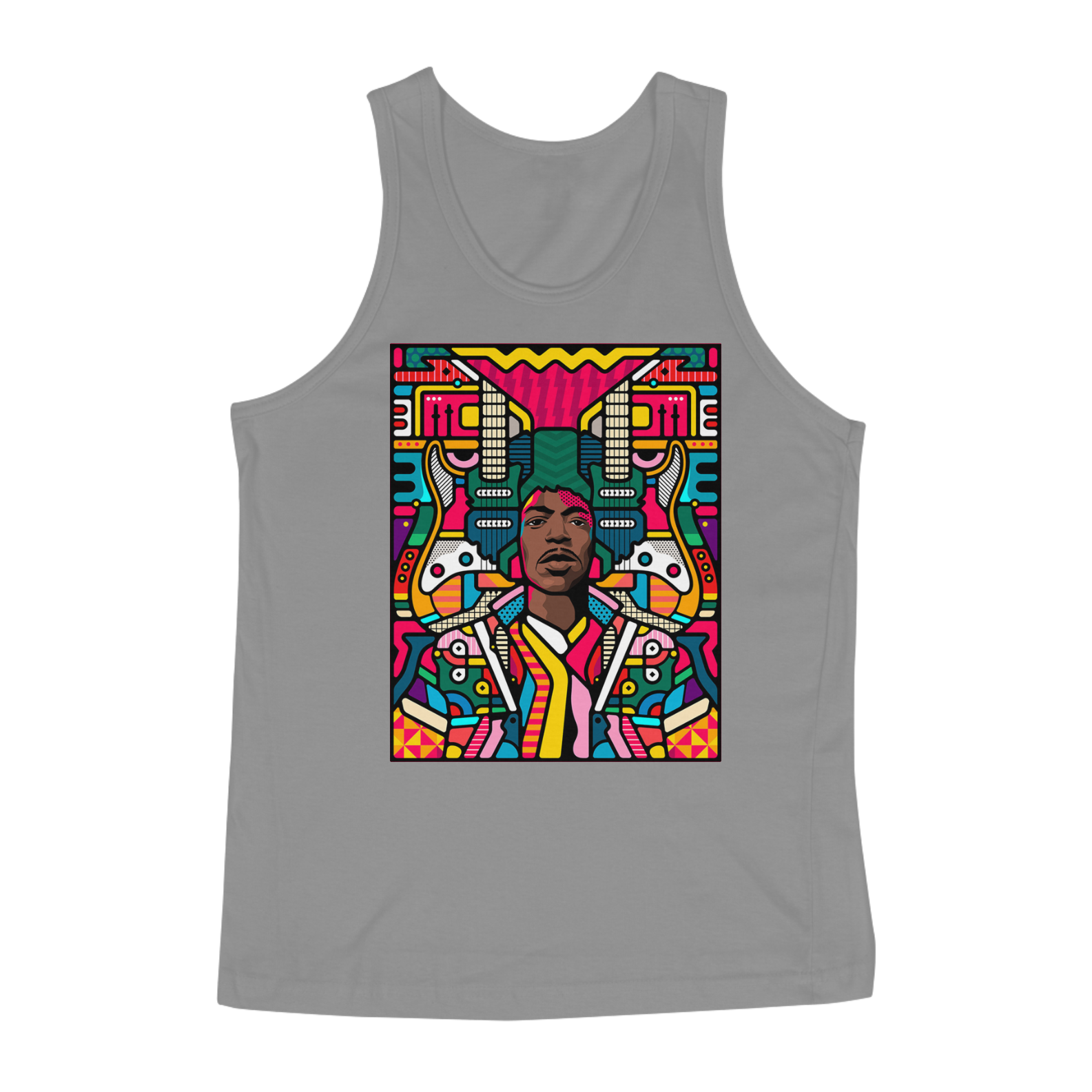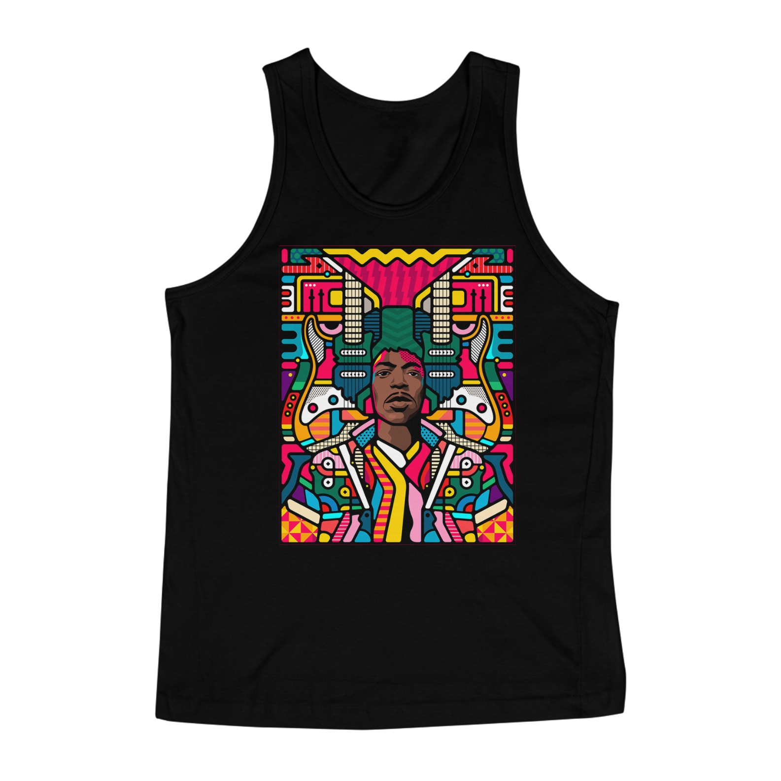 Celebre o talento inigualável e a energia elétrica de Jimi Hendrix com esta regata estampada em estilo arte pop. A estampa traz uma representação vibrante e colorida do lendário guitarrista, capturando sua icônica pose e seu estilo único.