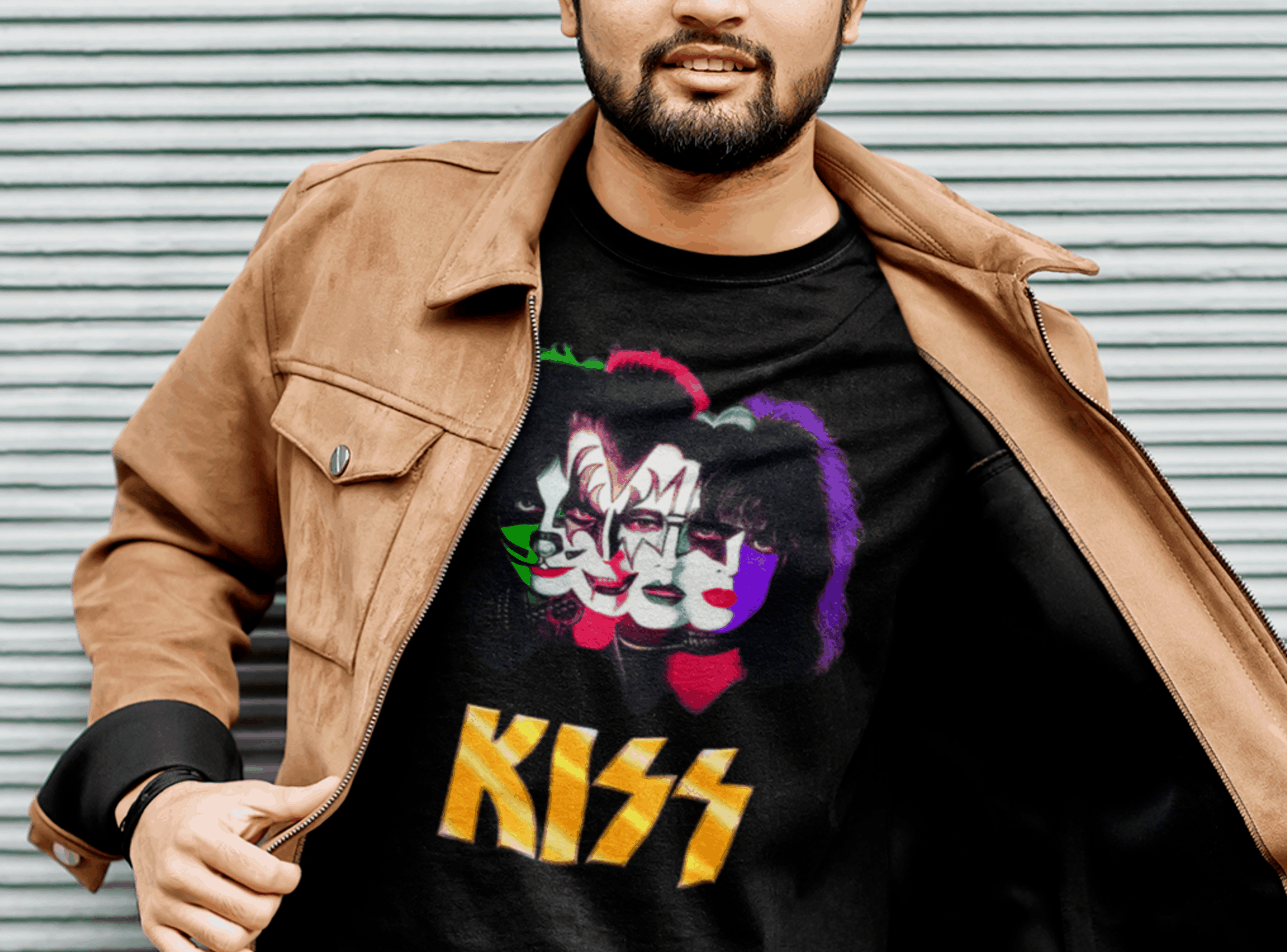 A arte icônica captura a presença teatral e a energia explosiva da lendária banda de glam metal.