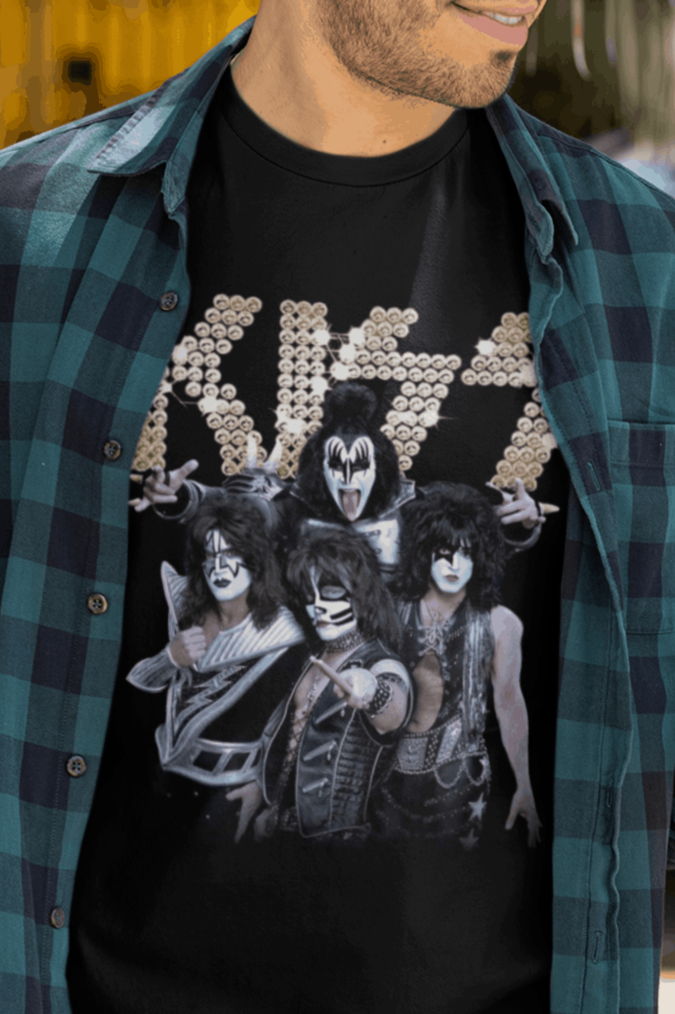 A arte icônica captura a presença teatral e a energia explosiva da lendária banda de glam metal.