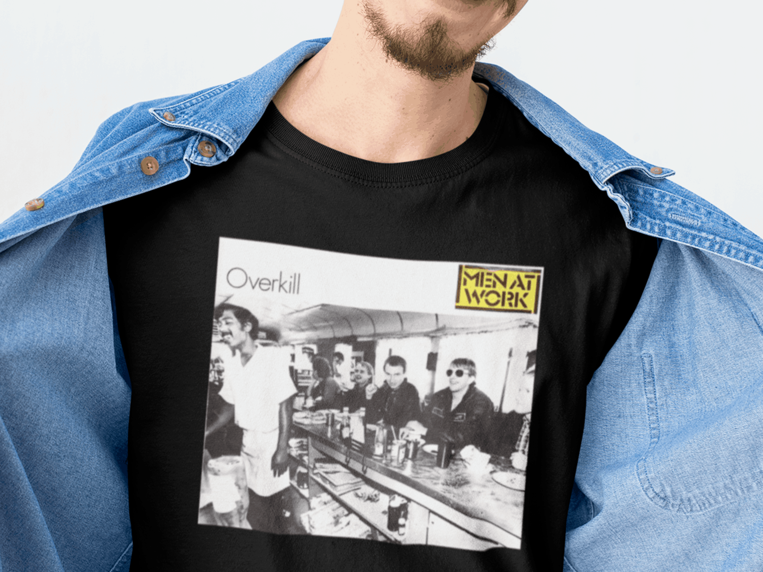 Esta camiseta é uma homenagem visual ao legado duradouro do Men at Work na história da música pop-rock.