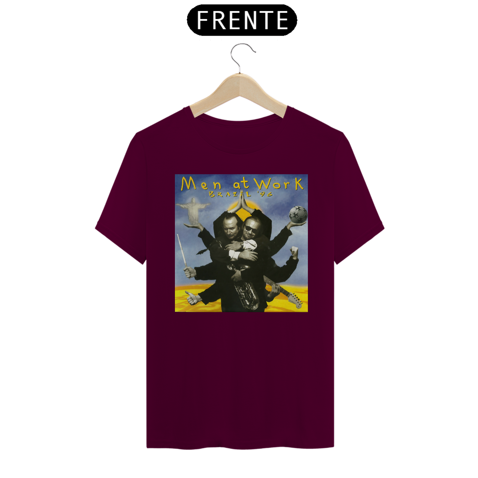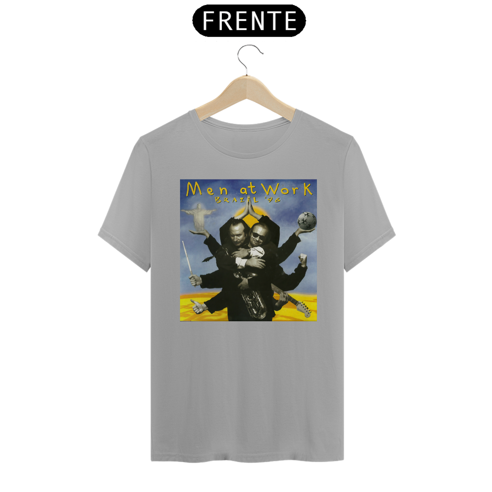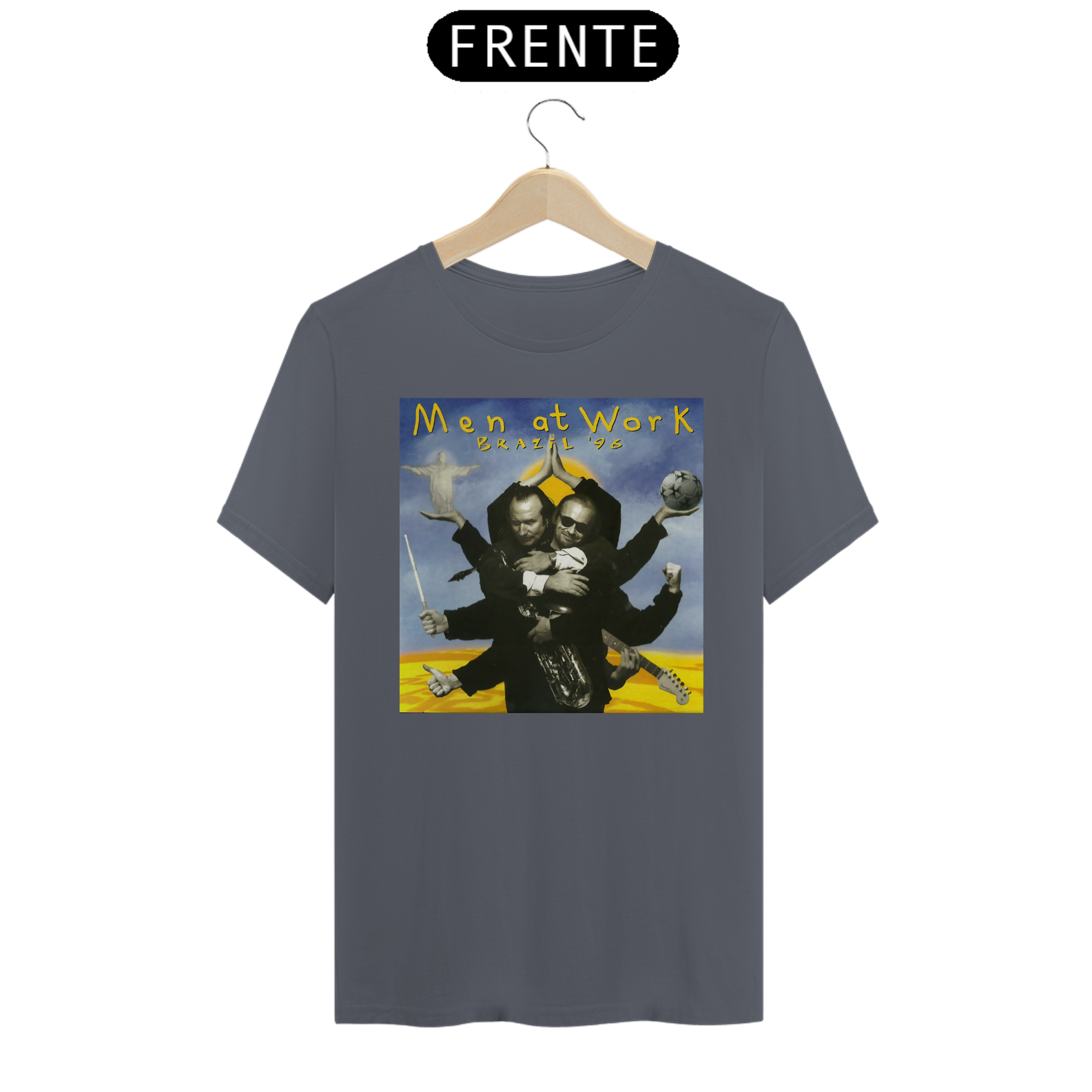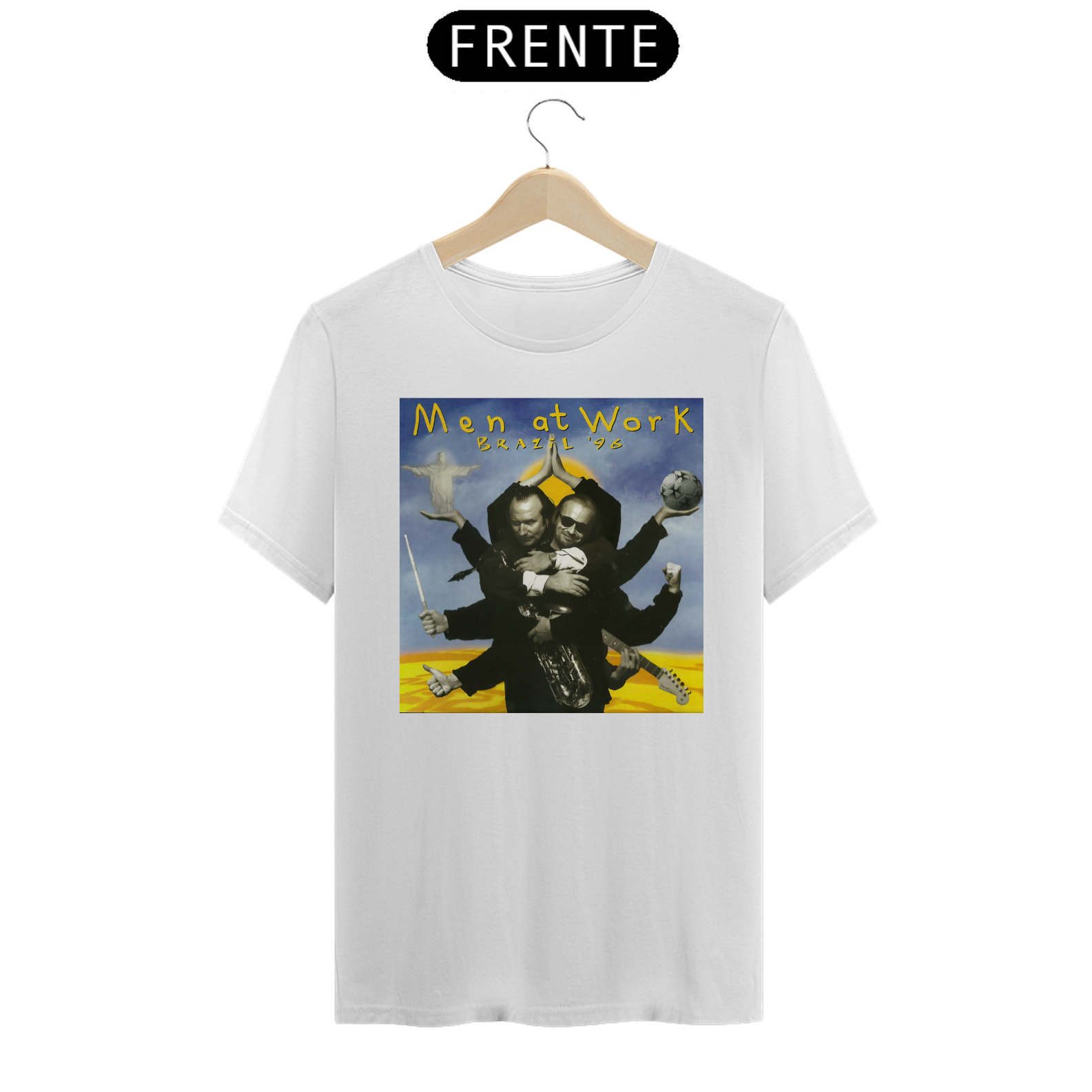 Esta camiseta é uma homenagem visual ao legado duradouro do Men at Work na história da música pop-rock.