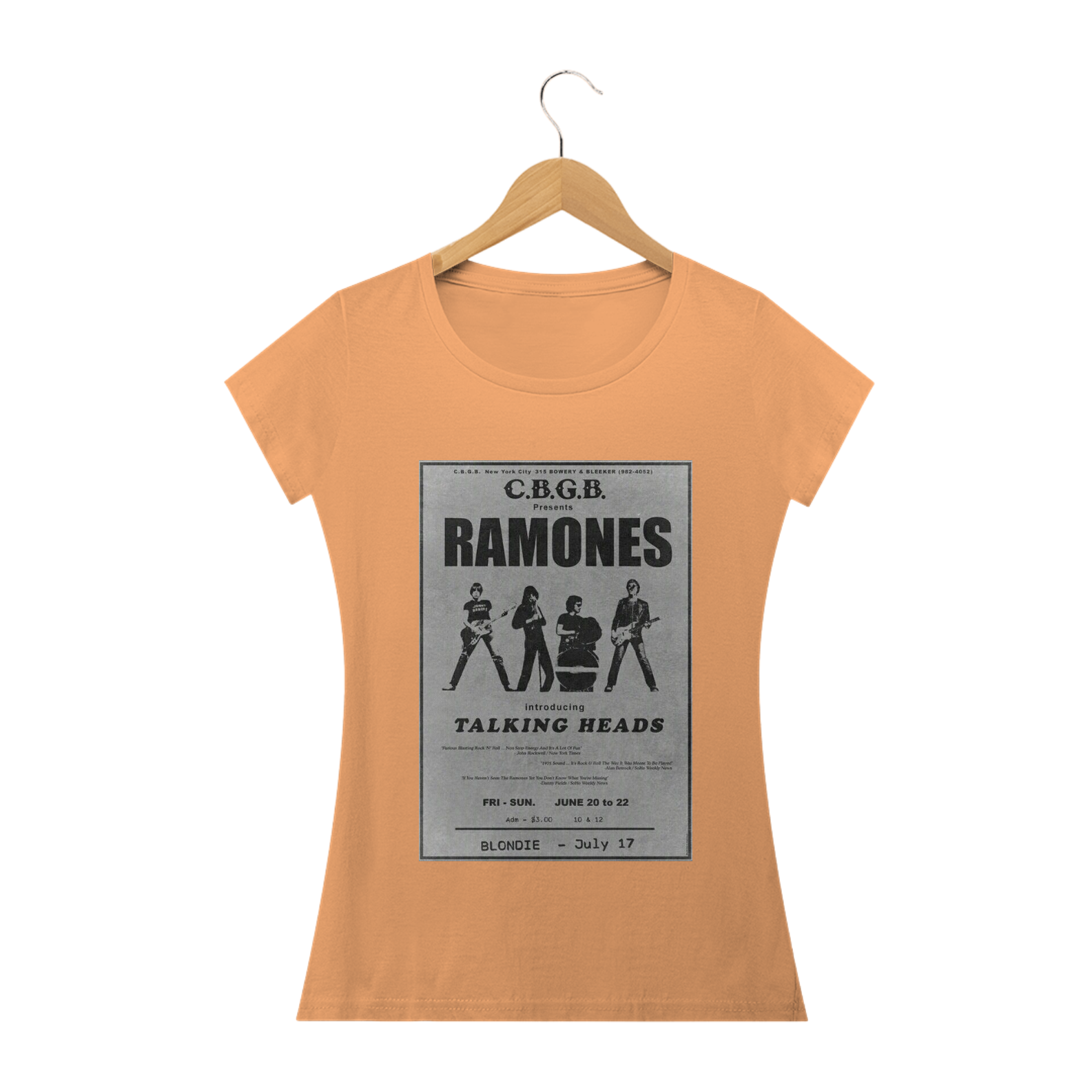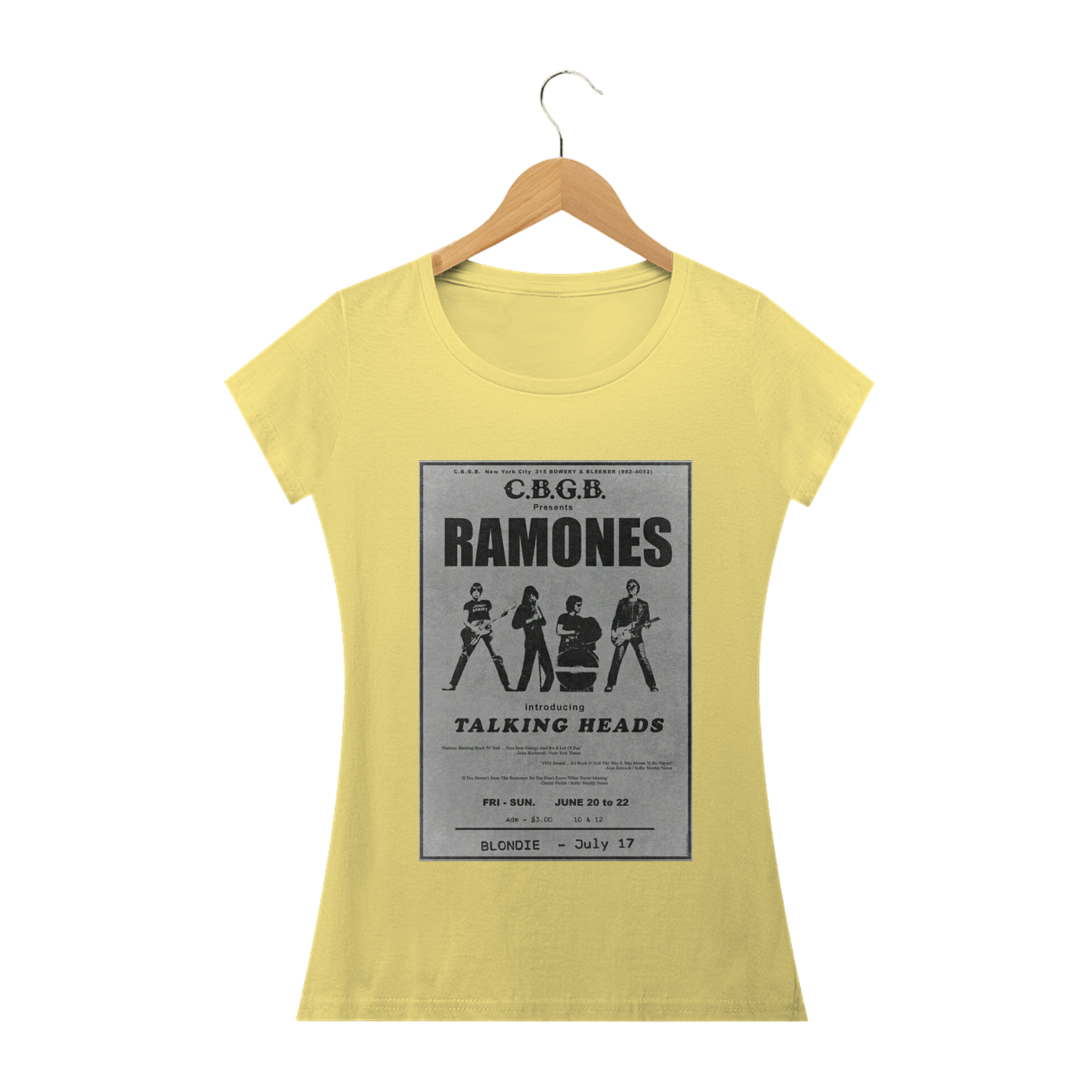 Apresentamos com entusiasmo a nossa camiseta feminina exclusiva, com uma estampa que vai encantar as fãs da banda Ramones: o inesquecível show ao vivo no C.B.G.B! Celebre o legado do punk rock com essa peça de roupa cheia de estilo e atitude.