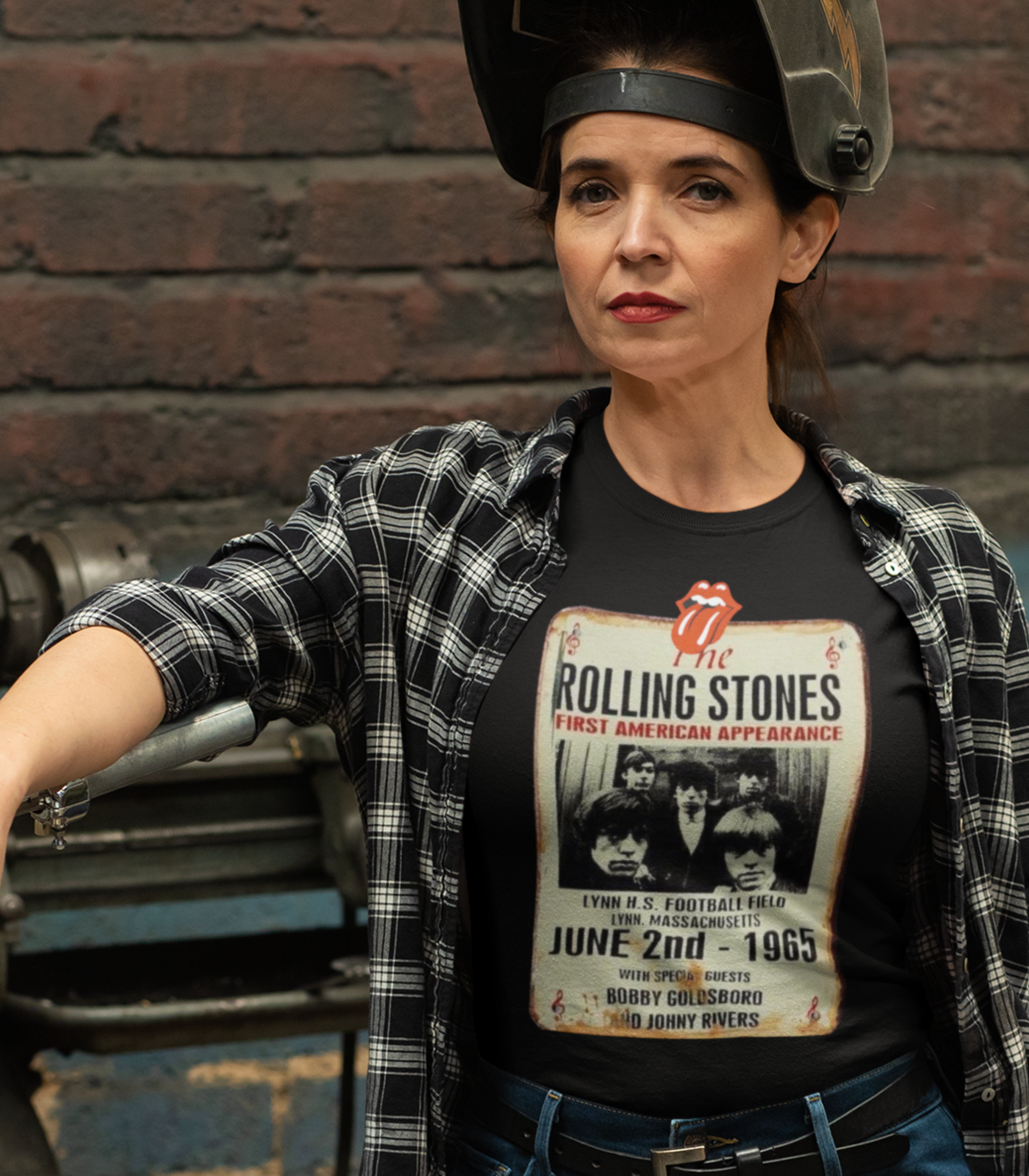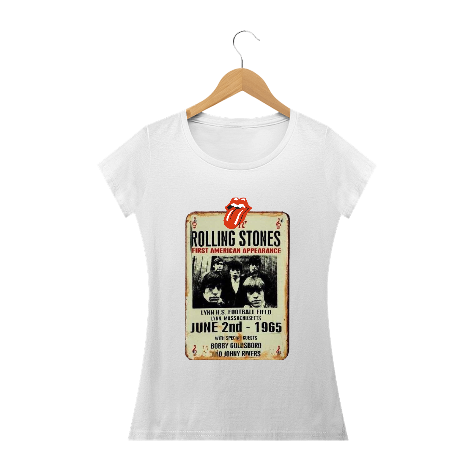 A camiseta feminina possui uma estampa inspirada em um antigo cartaz dos Rolling Stones ao vivo. A estampa retrata a icônica banda de rock em um estilo vintage, evocando a nostalgia e o estilo clássico do grupo.
