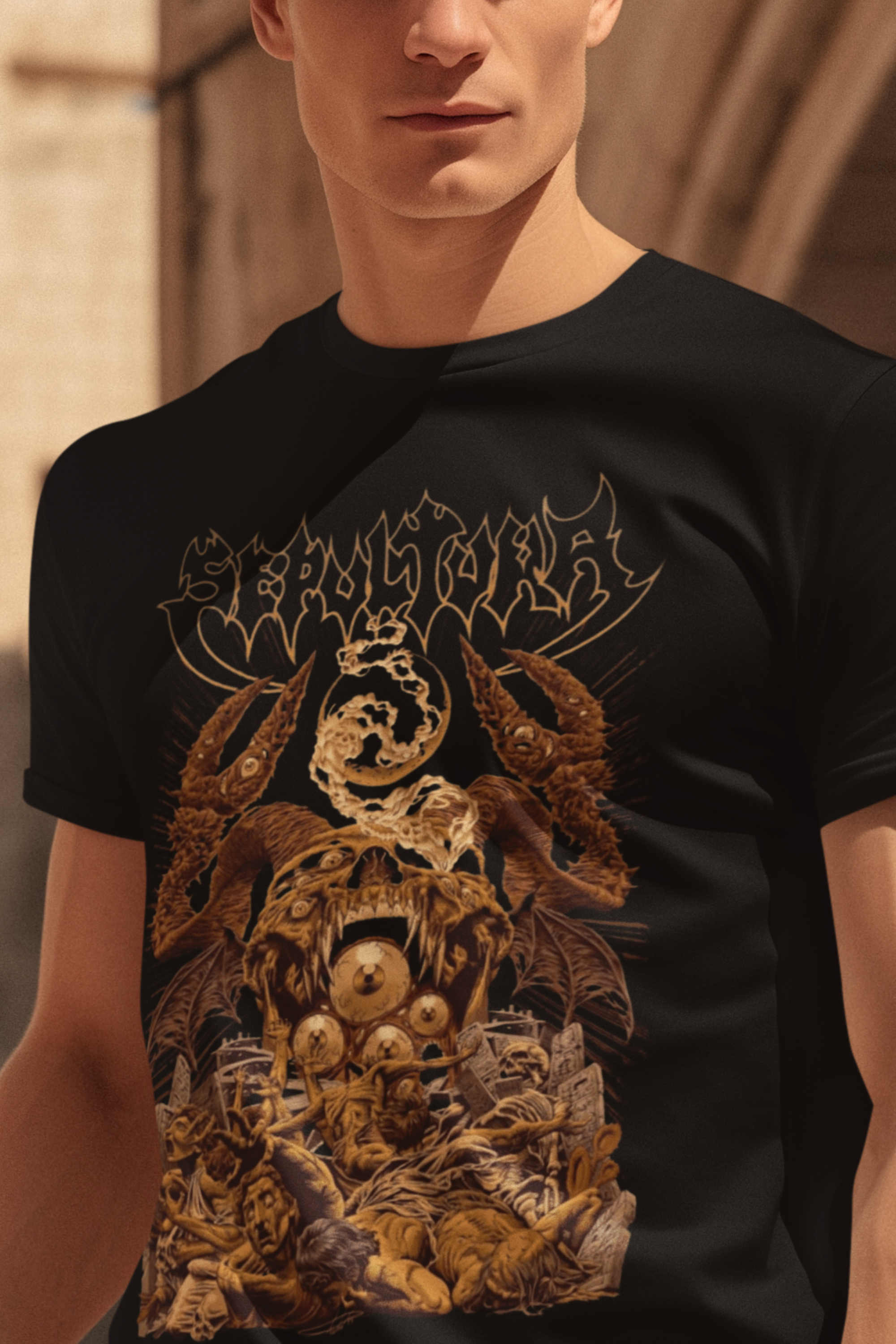 Camiseta estampada com a energia brutal e o som icônico da banda de metal brasileira Sepultura. Mostre seu apoio à cena do metal e ao poderoso legado do Sepultura com esta camiseta.