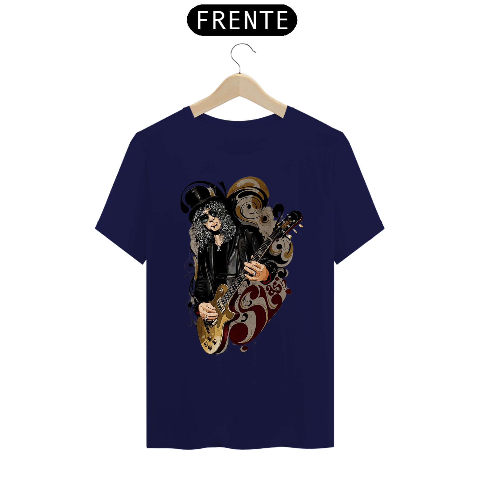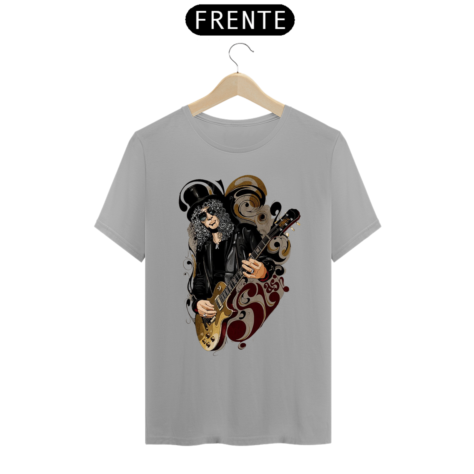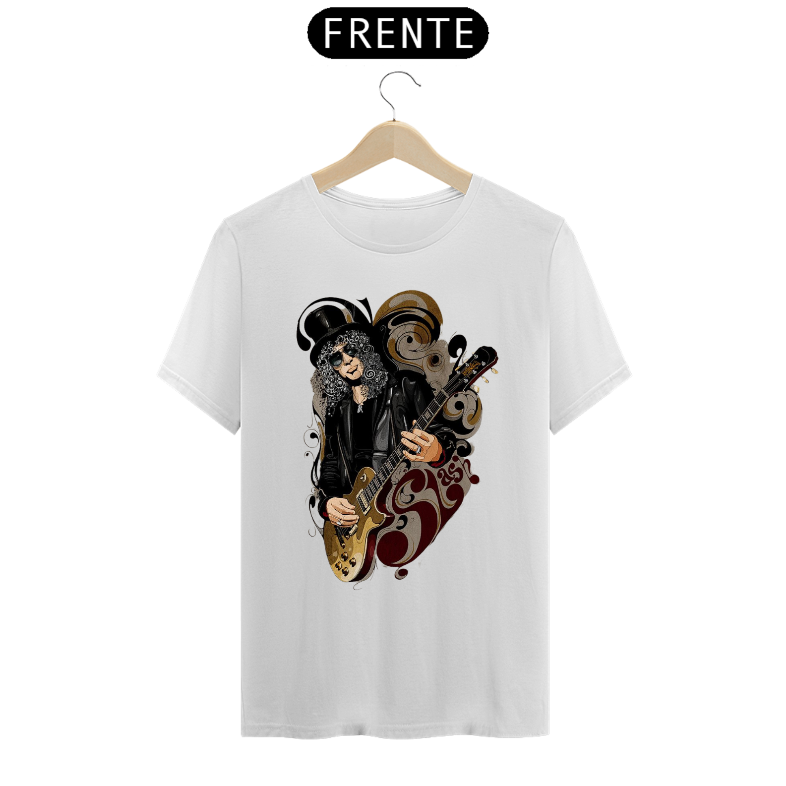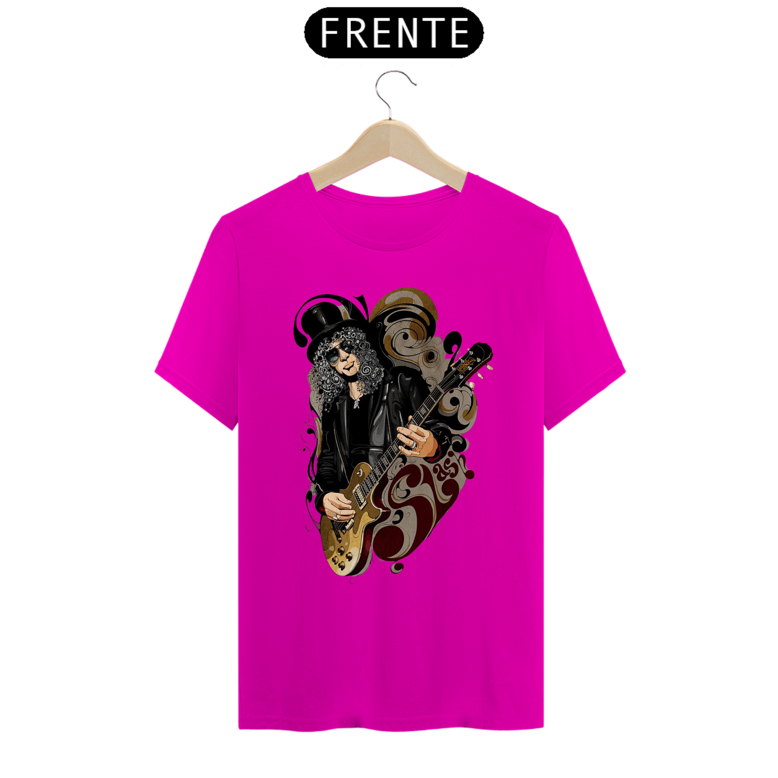 Esta camiseta estampada é uma homenagem ao lendário guitarrista Slash. A estampa traz uma imagem icônica do músico, com seu chapéu característico e sua guitarra em mãos, transmitindo toda sua atitude e talento.