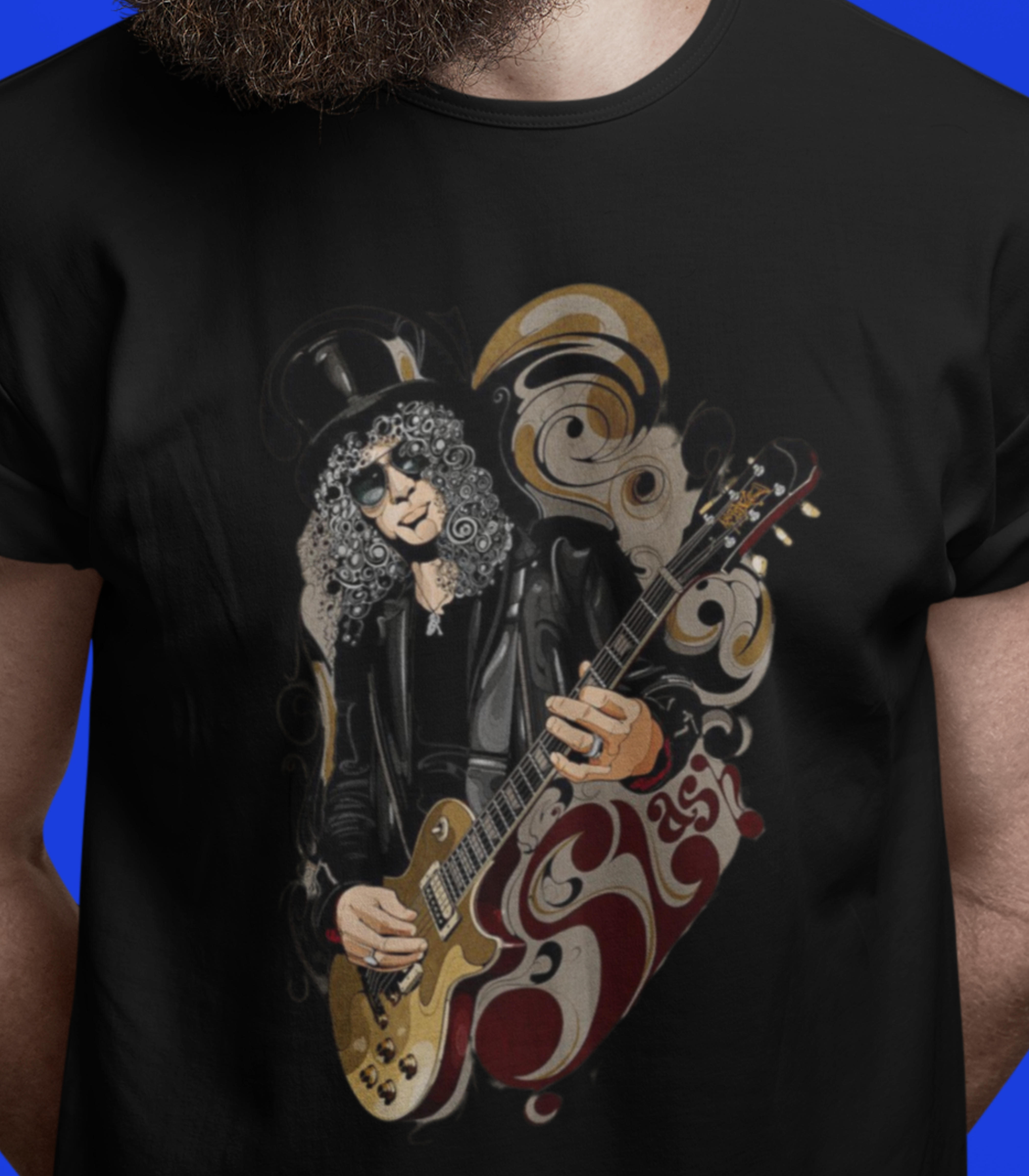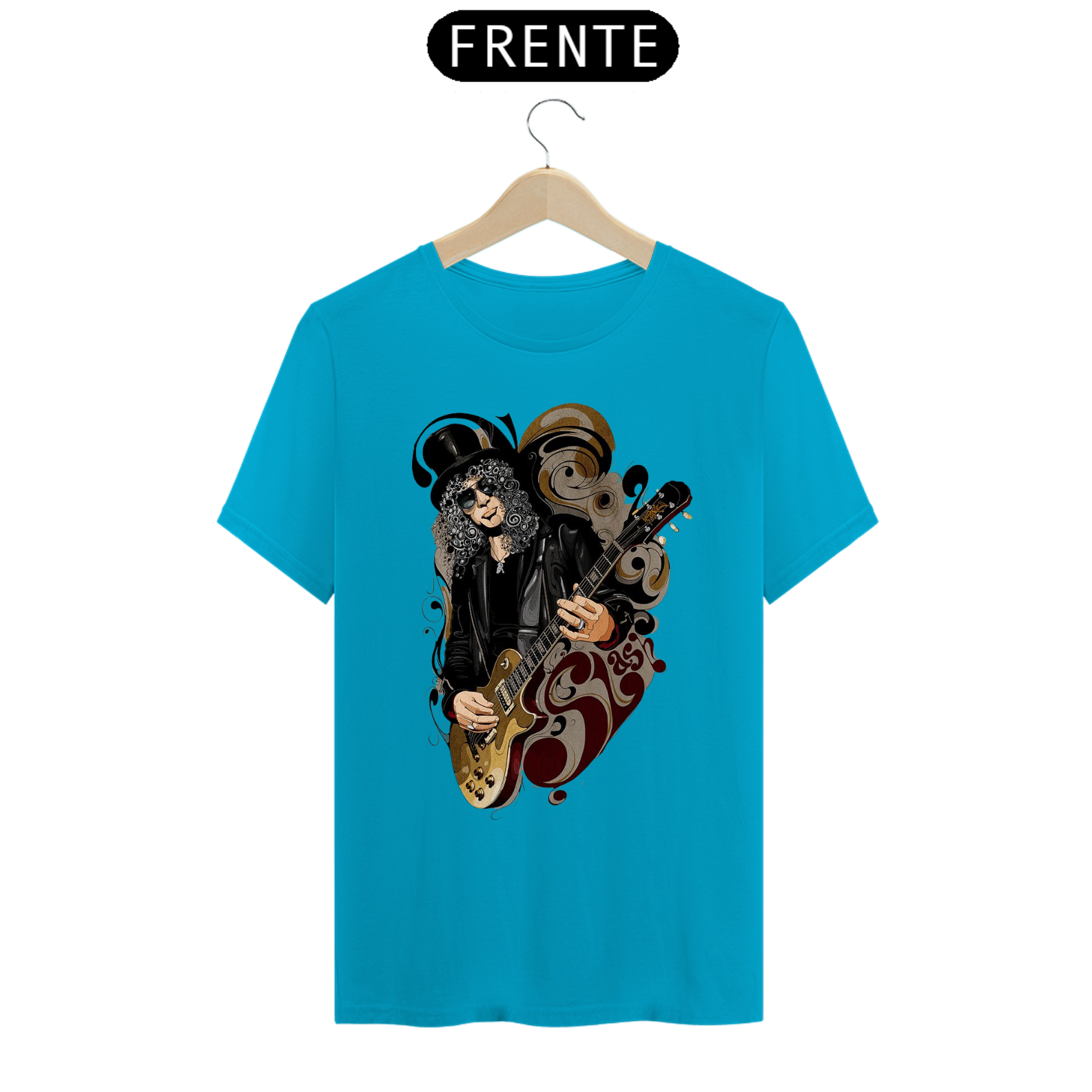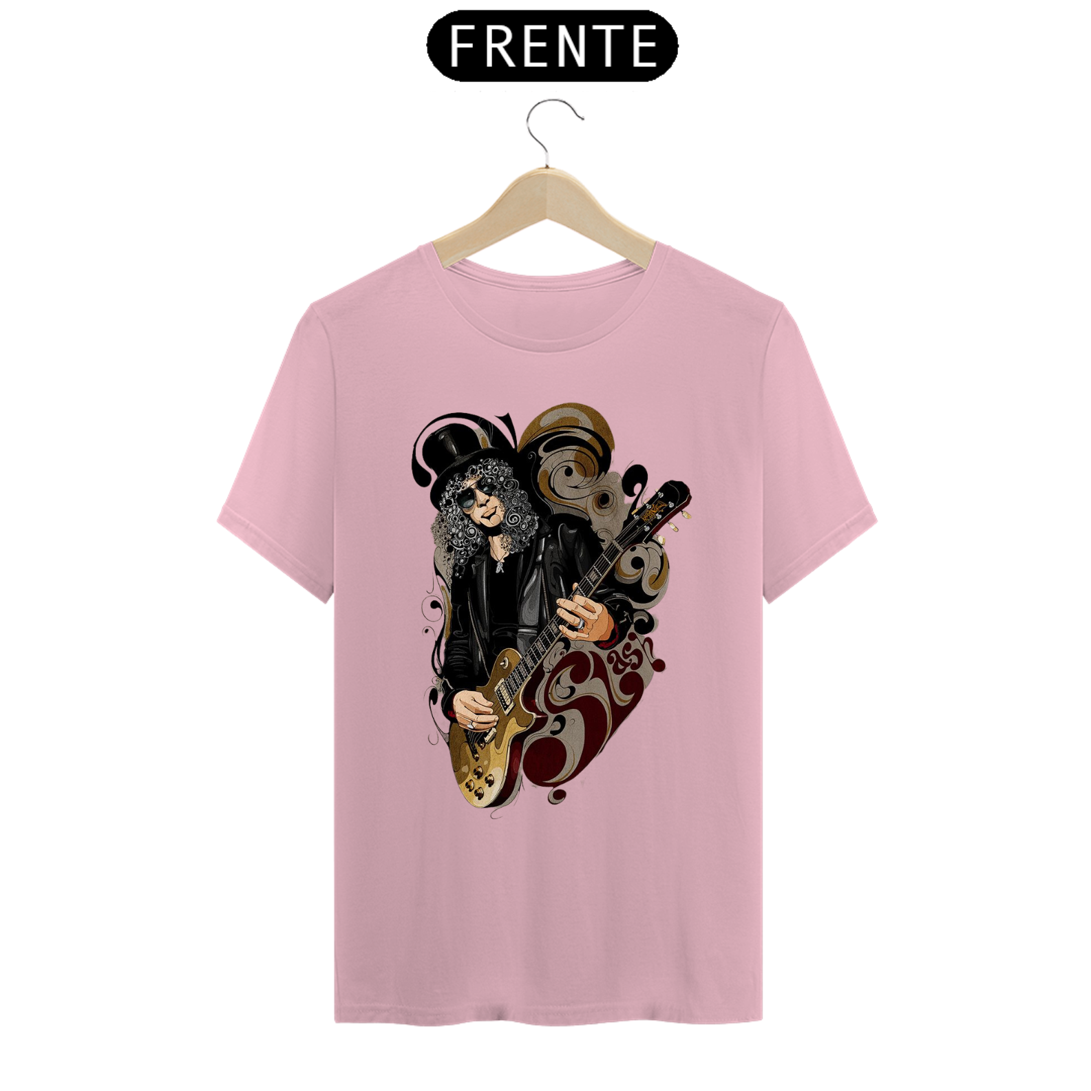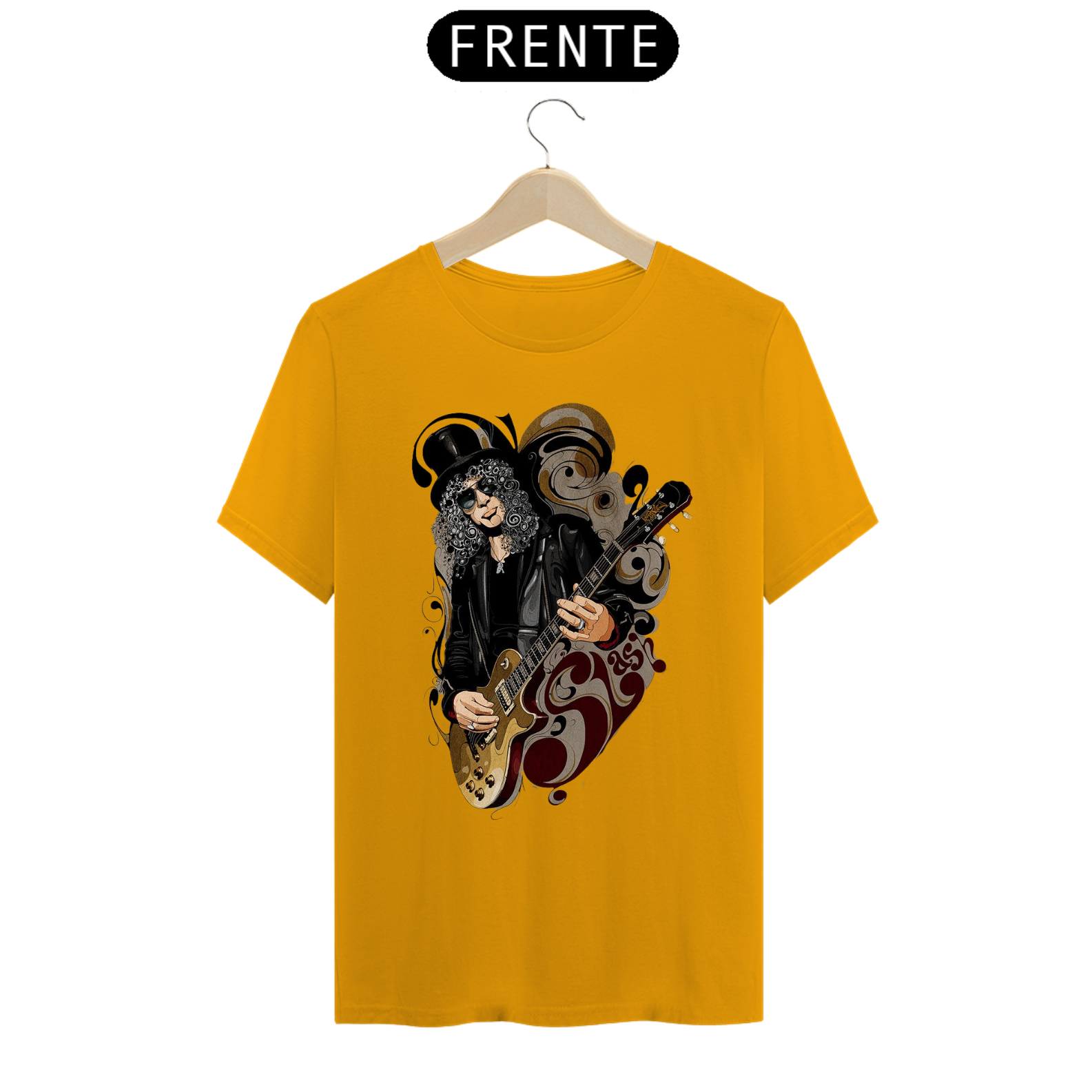 Esta camiseta estampada é uma homenagem ao lendário guitarrista Slash. A estampa traz uma imagem icônica do músico, com seu chapéu característico e sua guitarra em mãos, transmitindo toda sua atitude e talento.