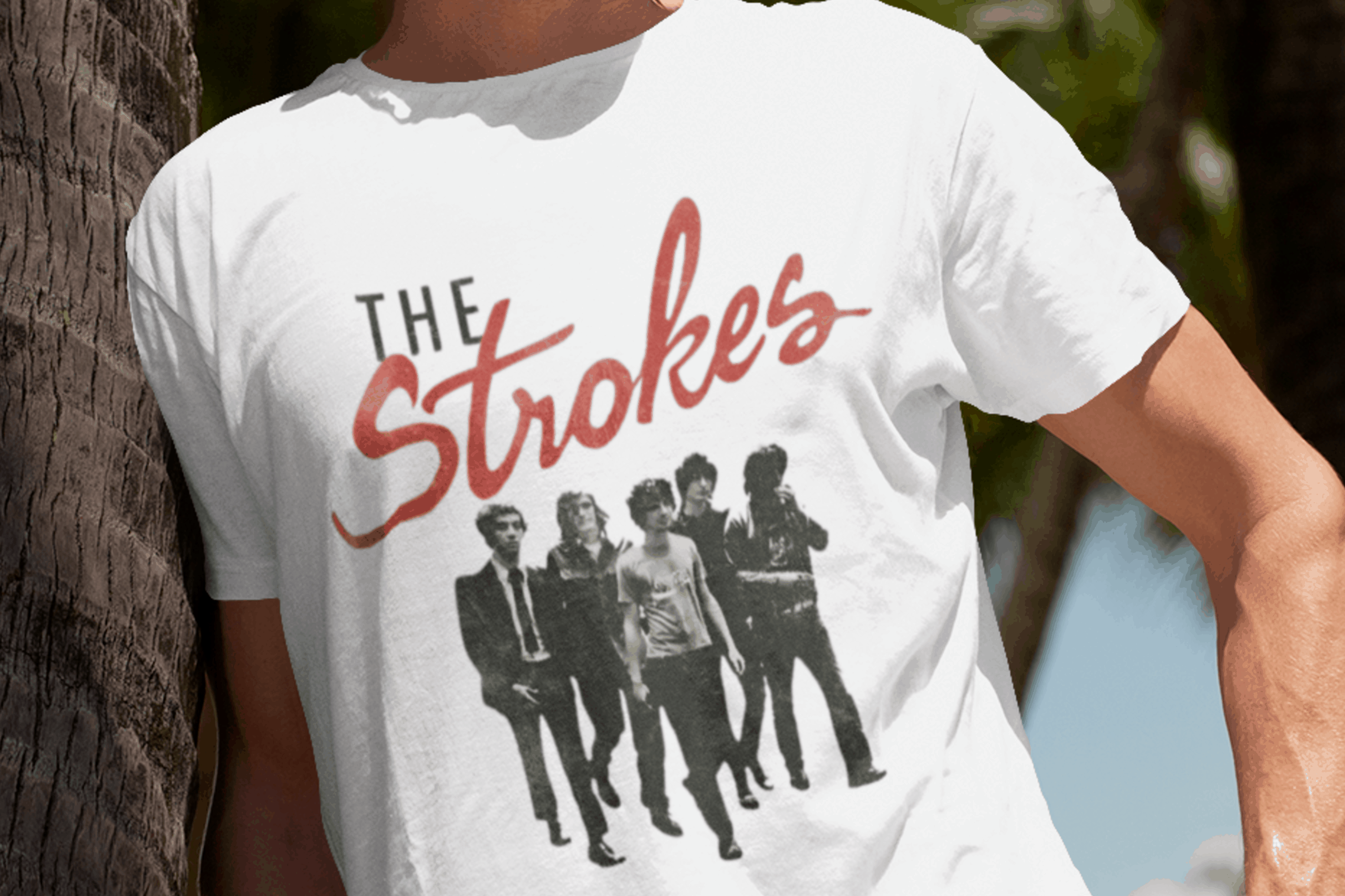 Esta camiseta é mais do que moda; é uma homenagem visual à influência duradoura dos The Strokes no cenário do rock alternativo.
